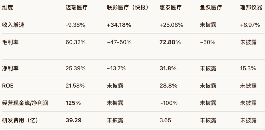 选取联影医疗(高端影像)、惠泰医疗(心血管介入)、鱼跃医疗(家用器械)、理邦仪器(监护等) 作为可比公司进行2025年关键指标对比(基于已披露数据):