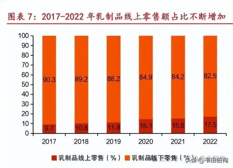 图表7:2017-2022年乳制品线上零售额占比不断增加