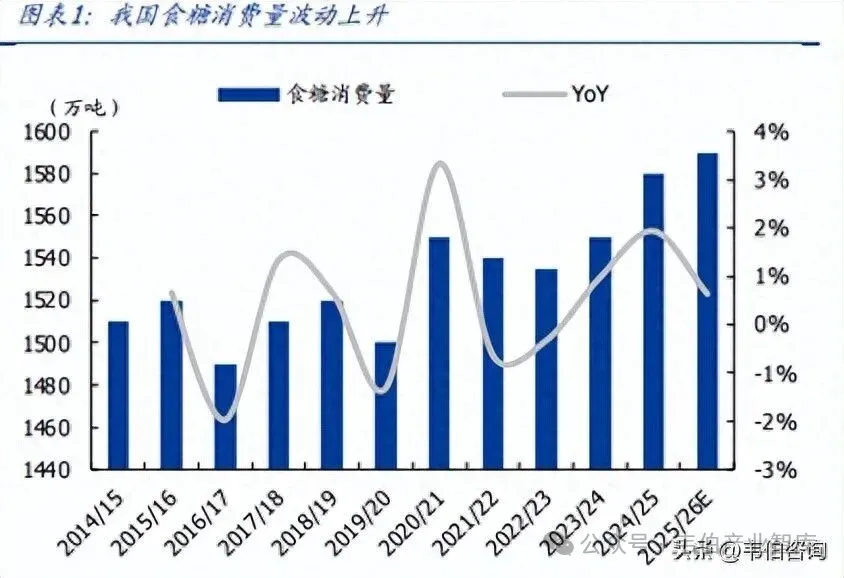 据农业部7月供需平衡表,2025/26榨季我国预计食糖消费量为1590万吨,同比增加0.6%,2015/16-2025/26榨季复合增速约为0.5%,食糖的总体消费增速虽然缓慢,但是消费规模依然创近10年新高。