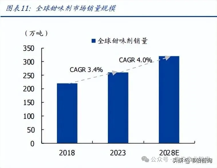 全球甜味剂从2018年的220万吨增至2023年的260万吨,年复合增速3.4%,预计2028年达到320万吨,年复合增速为4.0%,其中由于人工甜味剂是高倍甜味剂,以甜度贡献计,2023年人工甜味剂在全球甜味剂中的占比超80%。