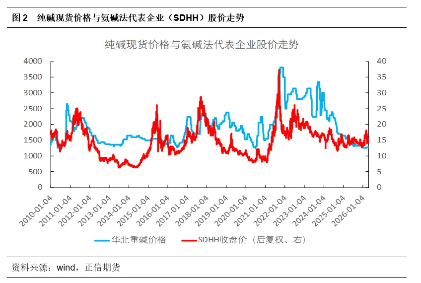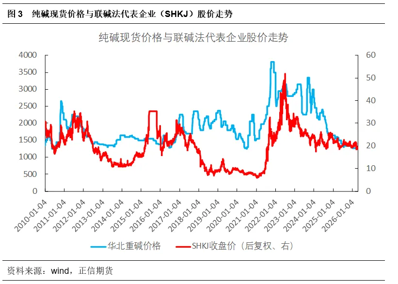 当行业处于“供需格局清晰、成本驱动明确、政策预期一致”的状态时,纯碱股票与期货价格基本会呈现同步走势,具体可分为:(一)行业供需格局出现明确趋势性变化时。无论是供给端的收缩还是需求端的爆发,只要形成明确的趋势,纯碱股票与期货价格都会同步响应上涨,比如是在2021年双碳政策下,股票和期货同步上涨;而当新产能集中投放、需求疲软导致供需失衡时,期货价格先行下跌,股票市场会下调企业估值,股价随之下行,比如在2023年-2024年新增产能集中投放,导致纯碱价格重心震荡下移,期货与股票价格同步走弱(虽然期货出现阶段反弹,但年度重心下移)。(二)成本端出现大幅波动且传导顺畅时。当煤炭等核心原材料价格出现大幅波动时,会直接传导至纯碱期货价格,进而影响股票价格,形成同步走势。这种同步走势的核心前提是成本传导顺畅,即纯碱企业能够将成本波动顺利转嫁至产品价格,此时期货价格与股价的联动性最强,比如在2021年前三季度纯碱股票和期货均有大幅上涨,四季度煤炭回落,纯碱跟随回落。(三)宏观政策或行业政策出现重大利好/利空时,宏观政策(如货币政策、财政政策)和行业政策(如供给侧改革、产能调控、出口政策)的重大调整,会同时影响纯碱期货和股票市场,导致二者走势同步。