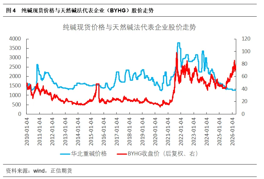 尽管纯碱股票与期货价格整体联动性较强,但在“预期分歧、短期扰动、企业个股差异”等场景下,二者走势会出现背离,即一方上涨、一方下跌,或涨跌幅度差异显著,具体可分为:(一)期货市场短期资金炒作,脱离产业基本面时。由于纯碱期货短期易出现资金炒作导致期货价格波动脱离产业基本面,而股票价格更注重企业长期盈利预期,因此可能形成“期货涨、股票跌”的背离格局,尤其是在2023年表现明显,期货短期出现大幅上涨,但股票延续下行态势。(二)股票市场受个股自身因素影响,脱离行业趋势时。纯碱股票价格不仅受行业基本面和期货价格影响,还受企业自身经营状况、股权变动、业绩公告等因素影响,在2025年四季度至今尤为明显,纯碱股票行业指数主要成分股BYHG因为天然碱产能释放且成本优势明显,盈利预期增加推动股价延续上涨,由于BYHG市值明显高于其他成分股,在其他成分股股价下跌情况下纯碱股票指数依然上涨,从而造成了这阶段股票指数和期货指数相背离(可关注下文不同公司股价对比)。此外纯碱板块内企业的业务多元化也会导致股价与期货价格背离,如某纯碱企业同时涉足粘胶短纤等业务,当非纯碱业务业绩大幅增长时,即使纯碱期货价格下跌,企业整体盈利仍可能提升,股价也可能保持上涨,与期货价格走势背离。(三)行业供需预期出现分歧,期货与股票定价逻辑差异时。纯碱期货价格主要反映短期(3-6个月)的行业供需预期,而股票价格主要反映长期(1-3年)的企业盈利预期,当市场对行业短期与长期供需预期出现分歧时,二者走势会出现背离。(四)宏观经济或市场情绪出现分化时,也可能导致纯碱股票与期货价格走势背离。当宏观经济下行时,股票市场整体情绪低迷,即使纯碱期货价格因行业基本面改善而上涨,纯碱股票也可能因市场整体下跌而跟随回调,形成背离。此外当化工板块整体走势与纯碱期货走势分化时,也可能导致纯碱股票与期货价格背离。例如2026年一季度,化工板块整体受原油价格上涨带动而上涨,纯碱股票可能跟随板块上涨,而此时纯碱期货价格因自身供需疲软而下跌。
