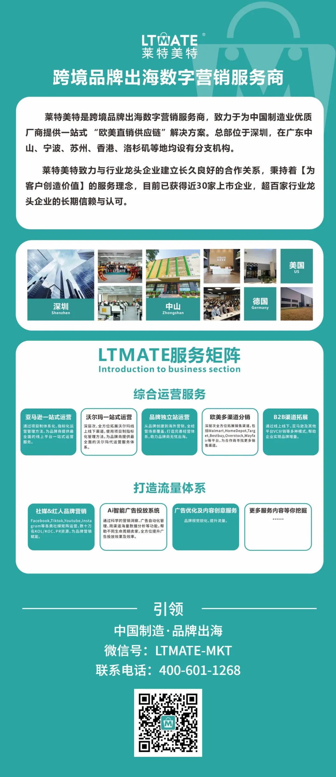 莱特美特是跨境品牌出海数字营销服务商,致力于为制造业优质厂商提供一站式“欧美直销供应链”解决方案,汇聚Amazon全球站点及其他跨境出口电商平台运营经验,拥有本土优秀运营人才、海归精英及B2C运营高手,具有多年数据分析、数据挖掘经验,拥有专业的IT团队、设计团队、运营团队、物流仓储团队及当地服务团队等。截至目前,莱特美特已获得近30家上市企业,数百家制造业龙头企业的长期信赖与认可。