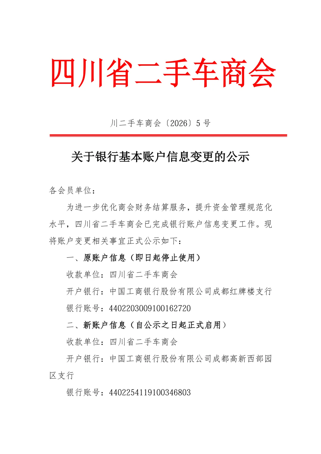 为进一步优化商会财务结算服务,提升资金管理规范化水平,四川省二手车商会已完成银行账户信息变更工作。现将账户变更相关事宜正式公示如下:一、原账户信息(即日起停止使用)收款单位:四川省二手车商会开户银行:中国工商银行股份有限公司成都红牌楼支行银行账号:4402203009100162720二、新账户信息(自公示之日起正式启用)收款单位:四川省二手车商会开户银行:中国工商银行股份有限公司成都高新西部园区支行银行账号:4402254119100346803本次账户信息变更仅涉及开户行及银行账号调整,收款单位名称保持不变。三、相关事项说明1、自本公示发布之日起,商会所有资金往来、会费收缴等全部业务,均统一通过上述新账户办理,原账户不再接收任何款项。2、商会会费缴纳标准保持不变,按原规定执行。3、账户变更后,商会仍将严格按照财务管理制度合理使用会费,于每年会员大会公布会费及资金整体使用情况,主动接受全体会员单位监督。4、若会员单位在账户变更及款项缴纳过程中有任何疑问,可及时与商会秘书处联系,联系人:杨洁,联系电话:13880884477。望各会员单位高度重视、积极配合,及时更新账户信息,确保资金往来顺利开展。
