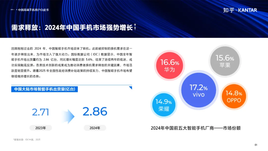 • 高端市场持续扩容,4000元以上机型占比近30%:2024年中国智能手机市场出货量达2.86亿台,同比增长5.6%。其中,高端机型(≥4000元)市场份额已达29.3%,较2019年翻倍,消费者更愿意为高品质、强体验买单。