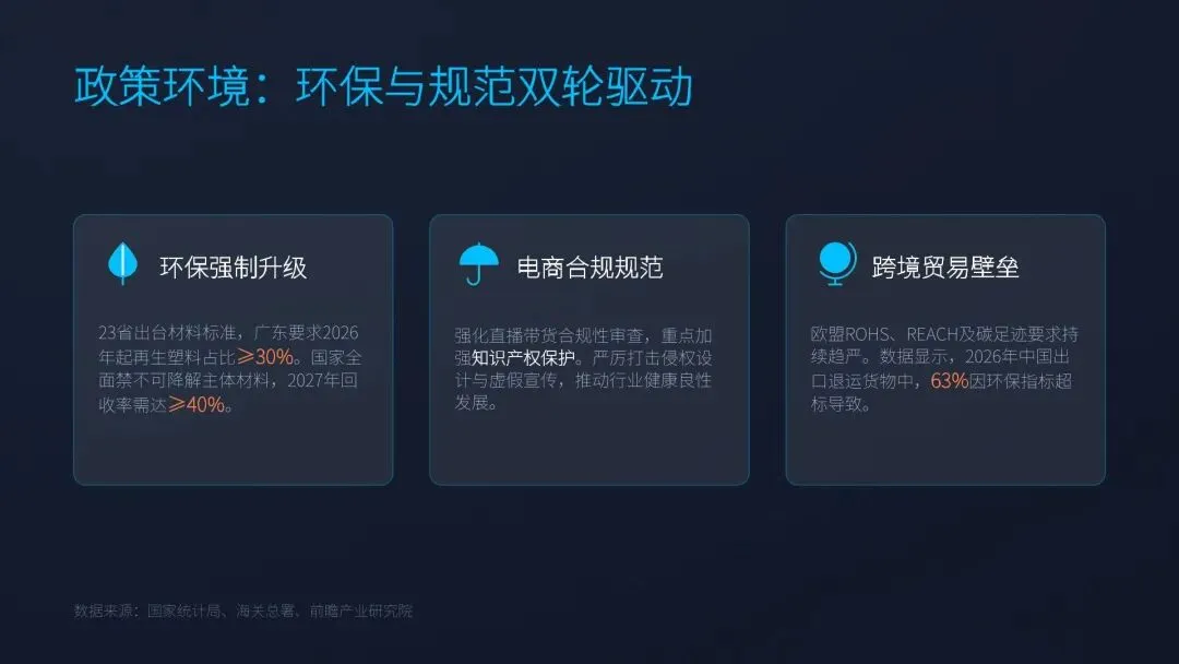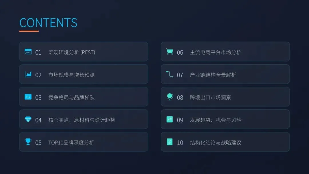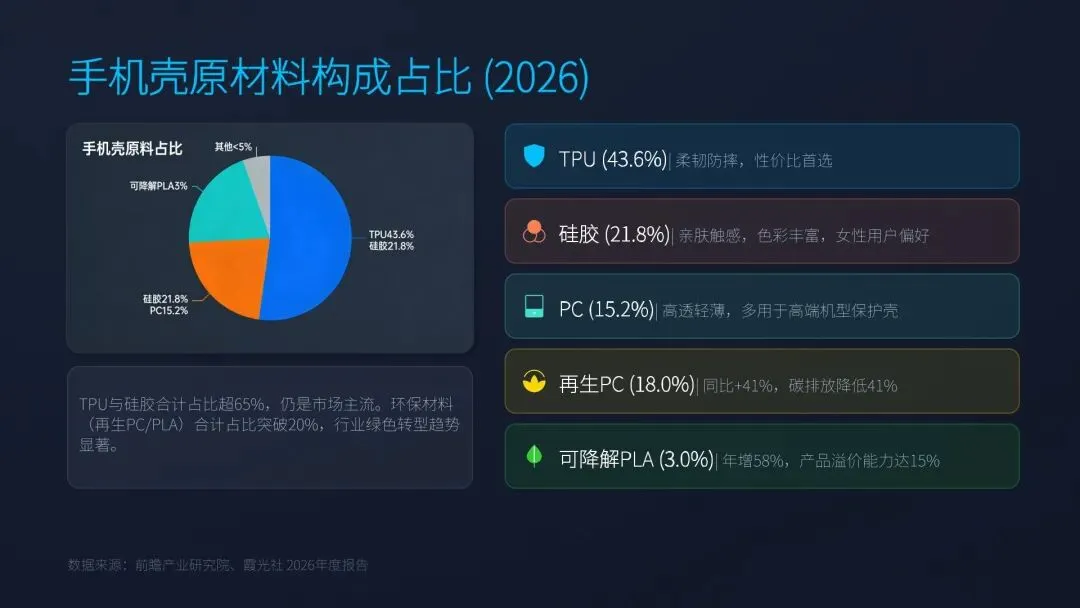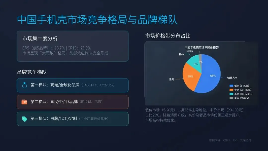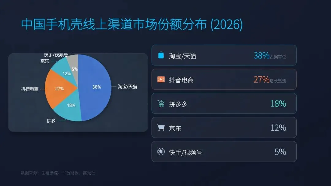 市场规模稳健增长,存量手机驱动高复购需求。2026 年市场规模 560 亿元,同比 + 12%,智能手机保有量超 11 亿台,换机周期延长提升配件需求。手机壳复购周期 1-6 个月,小额高频、韧性强劲,消费升级推动中高端份额提升,从低价走量转向质价比、功能与设计价值驱动增长。 线上渠道主导格局,抖音增速第一,平台分化清晰。线上渗透率 67.2%,淘宝 / 天猫占 38%、抖音 27%、拼多多 18%、京东 12%。抖音 GMV 同比 + 67.2%,内容种草驱动转化;天猫主打品牌与中高端,京东聚焦品质男性用户,拼多多以白牌低价下沉,渠道从铺货转向内容、场景与私域运营。 竞争高度分散,梯队分明,头部加速整合。CR5 仅 18.7%、CR10 26.3%,第一梯队为 CASETiFY、OtterBox 等高端品牌;第二梯队为图拉斯、倍思等高性价比国民品牌;第三梯队为白牌与定制厂。低价(5-20 元)占 65%,中高端快速提升,行业从价格战转向品牌、研发、供应链综合竞争。 消费决策四重驱动:防护、颜值、功能、环保并行。核心需求依次为防护(45%)、颜值个性(35%)、功能集成(15%)、环保材质(5%)。磁吸、散热、支架、折叠屏专用成标配,IP 联名溢价 30%-100%,再生 PC、可降解 PLA 占比突破 20%,消费者愿为绿色支付 15% 溢价,个性化定制渗透率超 25%。 产业链升级与跨境双轮驱动,机会与风险并存。上游材料向 TPU、硅胶、再生料、芳纶升级;中游珠三角长三角集聚,C2M 小单快反普及;下游全域渠道融合。跨境出口 2026 年破 35 亿美元,北美欧洲为主力市场。风险集中于同质化、成本上涨、环保合规、国际壁垒,机会在折叠屏、环保、IP、直播、出海。