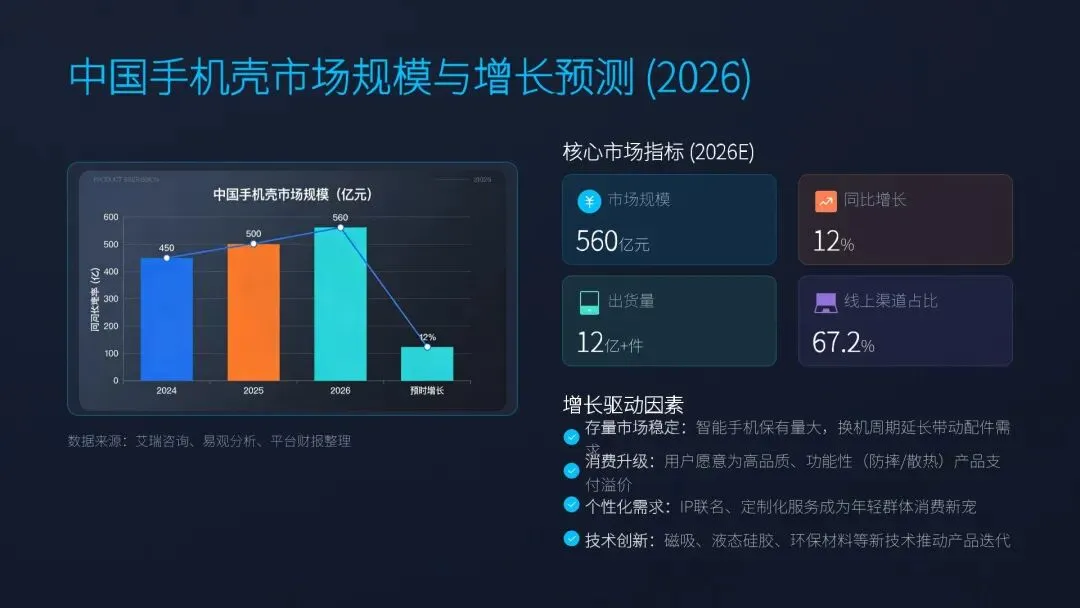 2026 年中国手机壳市场规模560 亿元,同比增长 12%,出货量超 12 亿件。行业呈现 “大市场、小企业、高分散” 格局,线上渗透率 67.2%,抖音增速领跑。消费由防护转向个性、功能、颜值、环保复合需求,折叠屏、磁吸、散热、IP 联名成热点,环保材料与 C2M 柔性生产驱动升级,跨境出口稳步增长,行业向品牌化、功能化、绿色化集中。
