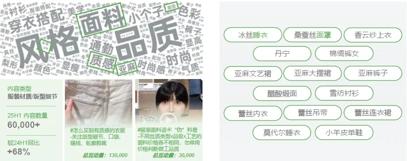 站内“冰丝睡衣”、“香云纱”、“醋酸缎面”等材质搜索词高速增长;站外,面料与质感成为穿搭核心讨论点,相关笔记互动量激增。消费者正在为 “看得见的品质”和“摸得着的舒适” 买单。