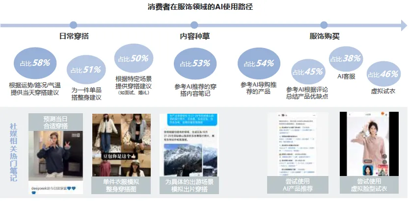 超过60%的消费者在服饰领域 “经常用到AI” 。无论是根据天气获取穿搭建议(58%),还是为一件单品搭配全身(51%),AI正无感化地深度介入消费者的种草与决策全链路。 - 即时需求蓝海显现
