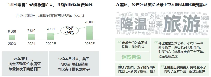 面对差旅、气温骤降等突发场景,“闪购”服饰成为新选择。值得注意的是,即便在即时消费中,消费者决策的前三位因素仍是 “材质”、“外观百搭性”和“可穿持久度” ,理性消费贯穿始终。