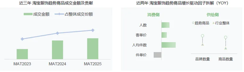 近三年,淘宝趋势商品成交增速高于行业整体,原创设计品牌和商品数量增幅显著,形成了需求拉动下的多元供给繁荣格局。消费者从站外种草到站内“扫货”的心智已成熟,并期待更多设计、价格带和即时送达的选择。