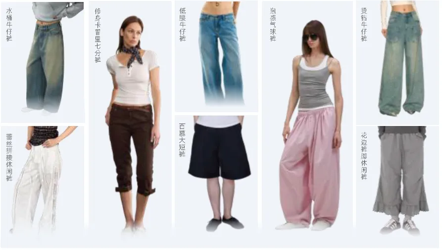 女士低腰、直筒裤及弯刀裤引领增长;木耳边、蕾丝、镂空、烫钻成为关键词。男士可调节腰、弯刀裤及香蕉裤受宠;褶皱、解构显机能感,千鸟格、肌理感侧重精致化。 - 机会