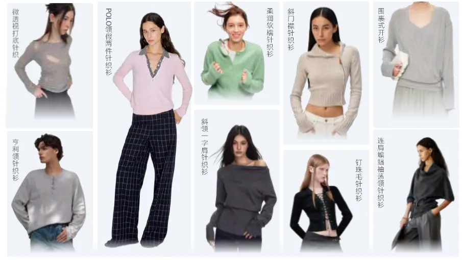 消费向3-5月早春倾斜。毛针织衫落肩、斜领、荡领型高增;费尔岛纹、波点、钉珠受欢迎。卫衣融入动物纹、蕾丝、飘带;一字领、挂脖型凸显潜力。 - 机会