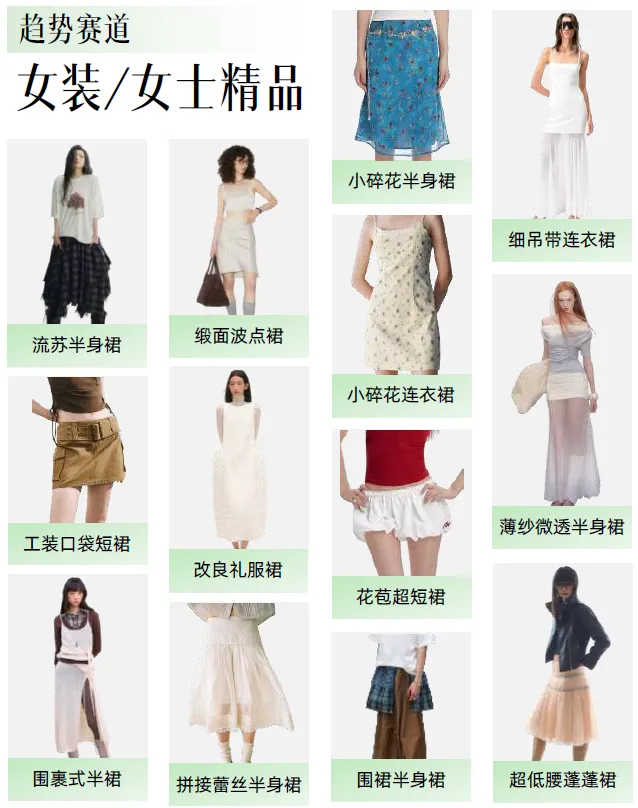 报告指出,裙装、T恤/吊带、衬衫、裤装、毛针织衫/卫衣、外套、鞋靴、包袋、内衣/家居服、服配构成十大重点品类,其趋势共同指向 “材质升级”与“设计创新”。