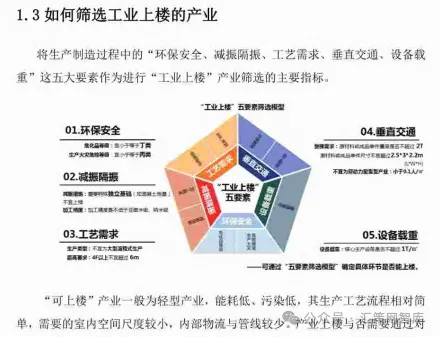 本白皮书对“工业上楼”建筑做一个初步定义:“工业上楼建筑是指具备相近行业高通用性、高集约性的特点,符合国家通用建筑标准及消防、节能、环保等现行规范和政策要求,用地性质为普通工业用地(M1)、新型产业用地(M0)、容积率不低于2.5、高度24m以上、层数5层及以上,配置工业电梯且集生产、研发、试验功能于一体的厂房。目前我国对“工业上楼”尚无统一的标准定义,“工业上楼”是一种新型产业空间的供给模式,也是一个有关产业、建筑、规划、运营、招商、政策等诸多方面的有机系统。对于“工业上楼”这个复杂系统可以从以下几个方面来理解: