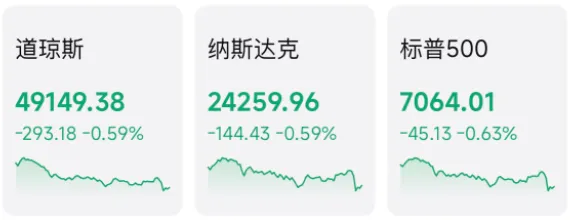 纳斯达克综合指数收跌0.59%,报24,260点;标普500指数收跌0.63%,报7,064点;道琼斯工业指数收跌0.59%,报49,149点