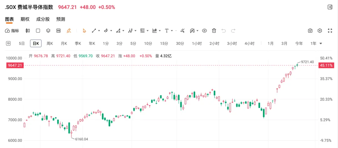 费城半导体指数逆势收涨0.50%,5连涨续创历史新高,再度展示了AI上游超强的市场认可度