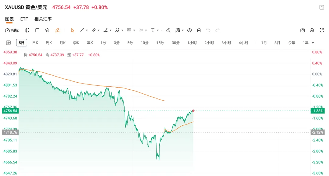 黄金现货昨晚一路走低,一度跌破4700美元,在停火消息传出后明显修复