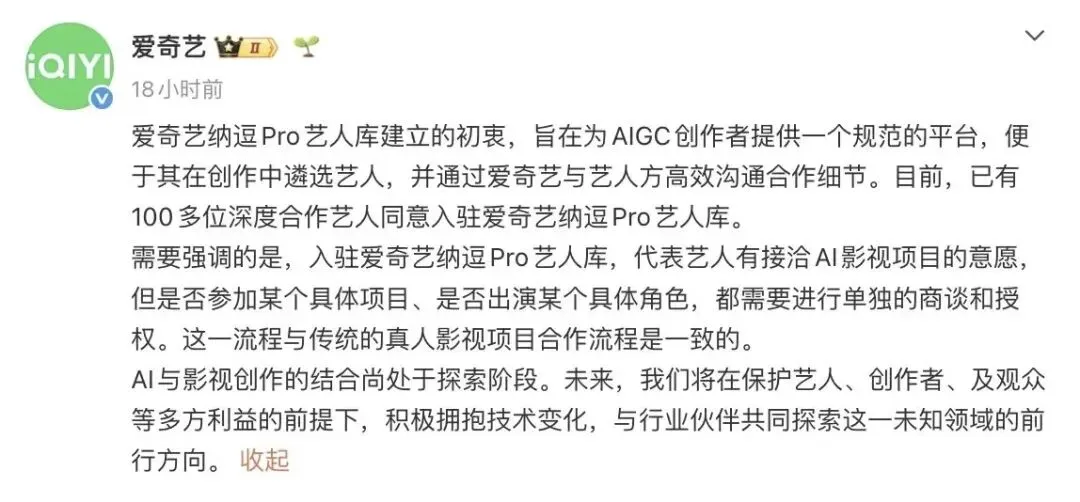 4月20日世界大会,爱奇艺创始人、CEO龚宇站在台上,意气风发发布纳逗ProAI艺人库,宣称100多位艺人已授权入驻。AI拍剧势不可挡,真人实拍未来要成“非遗”。