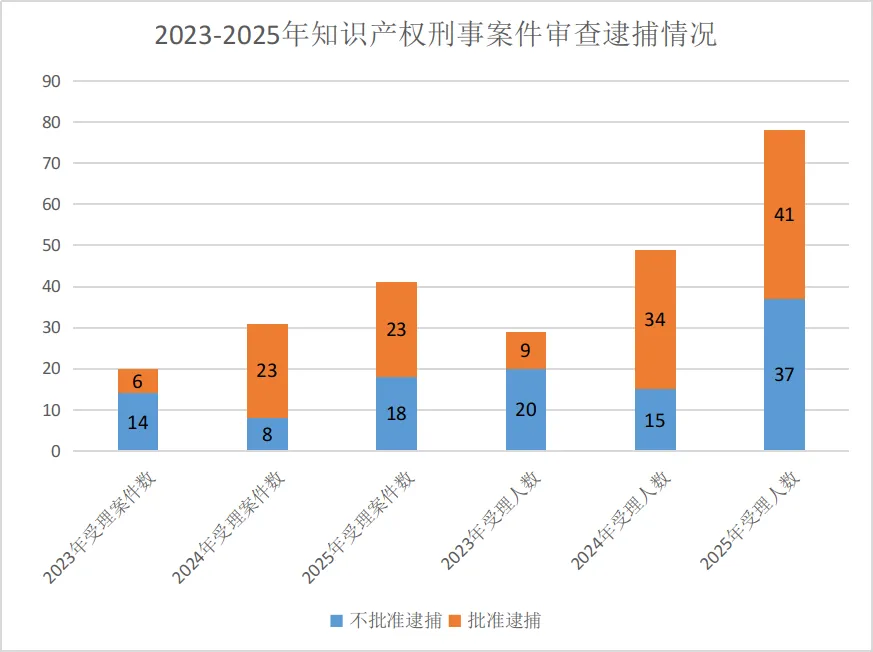 1.审查逮捕。2023年受理审查逮捕20件29人,批准逮捕6件9人,不批准逮捕14件20人。2024年受理审查逮捕案件31件49人,批准逮捕23件34人,不批准逮捕8件15人。2025年受理审查逮捕41件78人,批准逮捕23件41人,不批准逮捕18件37人。
