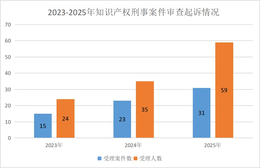2.审查起诉。2023年受理审查起诉15件24人,提起公诉11件20人,不起诉2件2人。2024年受理审查起诉23件35人,提起公诉20件32人,不起诉2件2人。2025年受理审查起诉31件59人,提起公诉21件44人,不起诉2件3人。