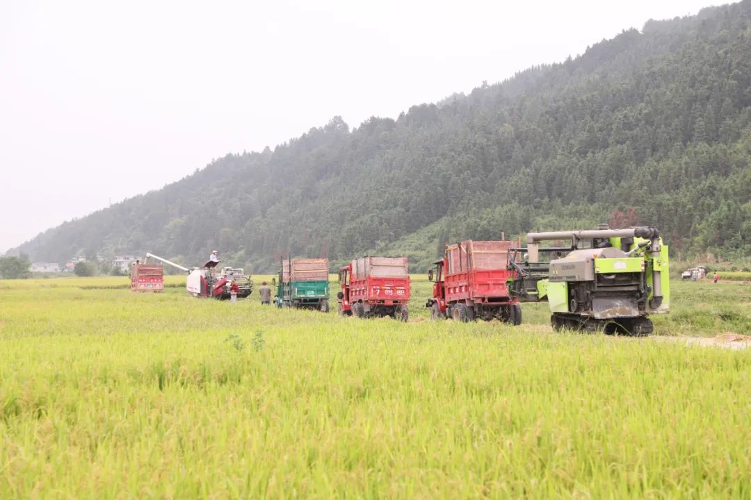 图为近日,凤城街道老寨村水稻制种喜获丰收,收割机正在收割成熟的稻种