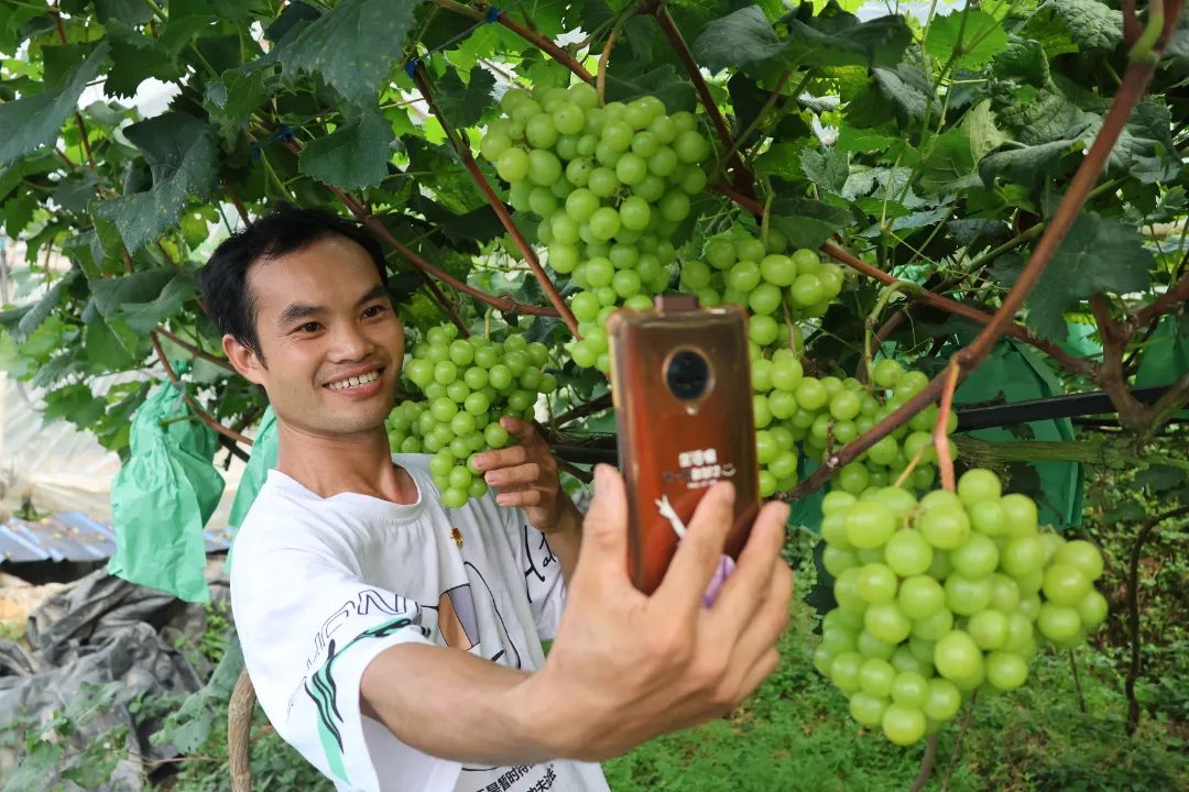 共和村党支部青年党员杨顺福与即将成熟阳光玫瑰合影为电商销售宣传造势。