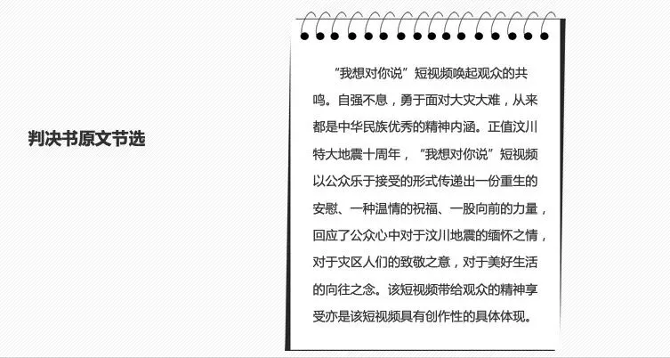 合议庭认为,涉案短视频以公众乐于接受的形式传递出一份重生的安慰、一种温情的祝福、一股向前的力量,回应了公众心中对于汶川地震的缅怀之情,对于灾区人们的致敬之意,对于美好生活的向往之念。该短视频带给观众的精神享受亦是该短视频具有创作性的具体体现。抖音案,是北京互联网法院的第一案,也是其每一案的缩影。北京互联网法院法官将对法律精神、互联网精神的理解融合在判决之中,选择了面向未来积极审慎的思考。