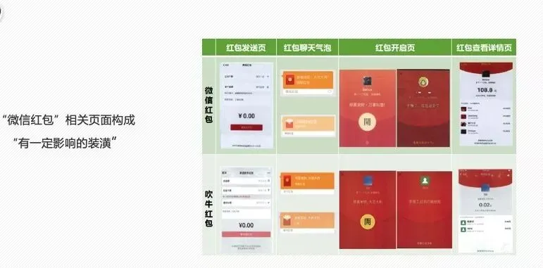 此案原告主张,被告“吹牛”应用软件中3款电子红包的聊天气泡、开启页与其在先的美术作品构成实质性相似,侵犯了其信息网络传播权;“微信红包”相关页面及“微信”整体页面系有一定影响的装潢,“吹牛”应用软件进行了整体抄袭。