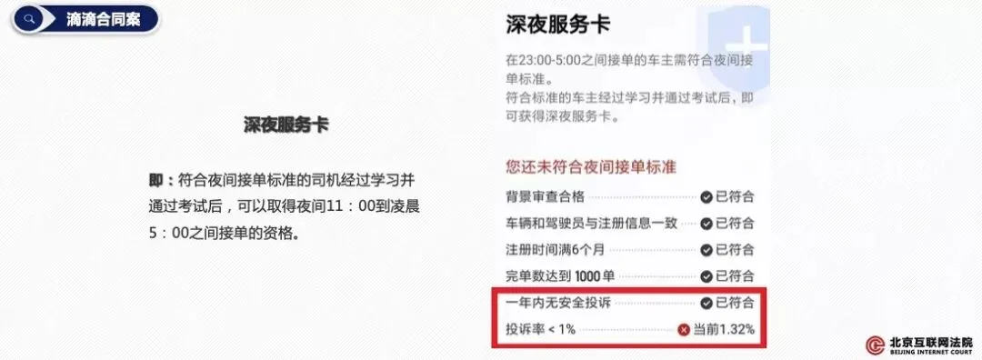 在此案中滴滴公司因乘客安全投诉而判定司机违规,限制其账号的深夜服务功能使其订单量大幅缩水,司机多次申诉未果,最终诉至法院要求赔偿损失。事实上,司机行为并未违反平台规定,滴滴却未能根据规定对事实进行核查。