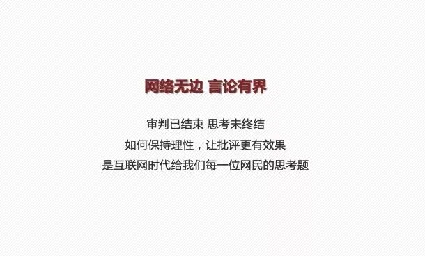 合议庭认为:一方面法律保护公民名誉权和人格尊严,另一方面,对于不符合社会主流价值观的事件进行批评,也是网民正常的情感和言论表达。同时,被告是网络大V、律师,也从事件旁观者转变为知情者、相关者,在判断其言论是否适度时应予以考量。该案判决被赞“教科书式判决”,网络无边,言论有界,如何保持理性,是每个网民都需思考的。