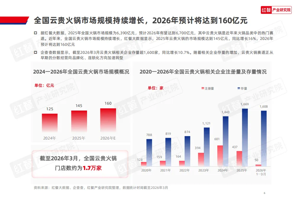 云贵火锅已成为国内火锅市场快速崛起的特色细分赛道,2025年市场规模达145亿元,预计2026年增至160亿元,全国门店数约1.7万家,呈现西南领跑、全国扩张的发展态势。其热度攀升源于风味契合消费需求、文旅与政策双重驱动、供应链日趋成熟三大核心因素。