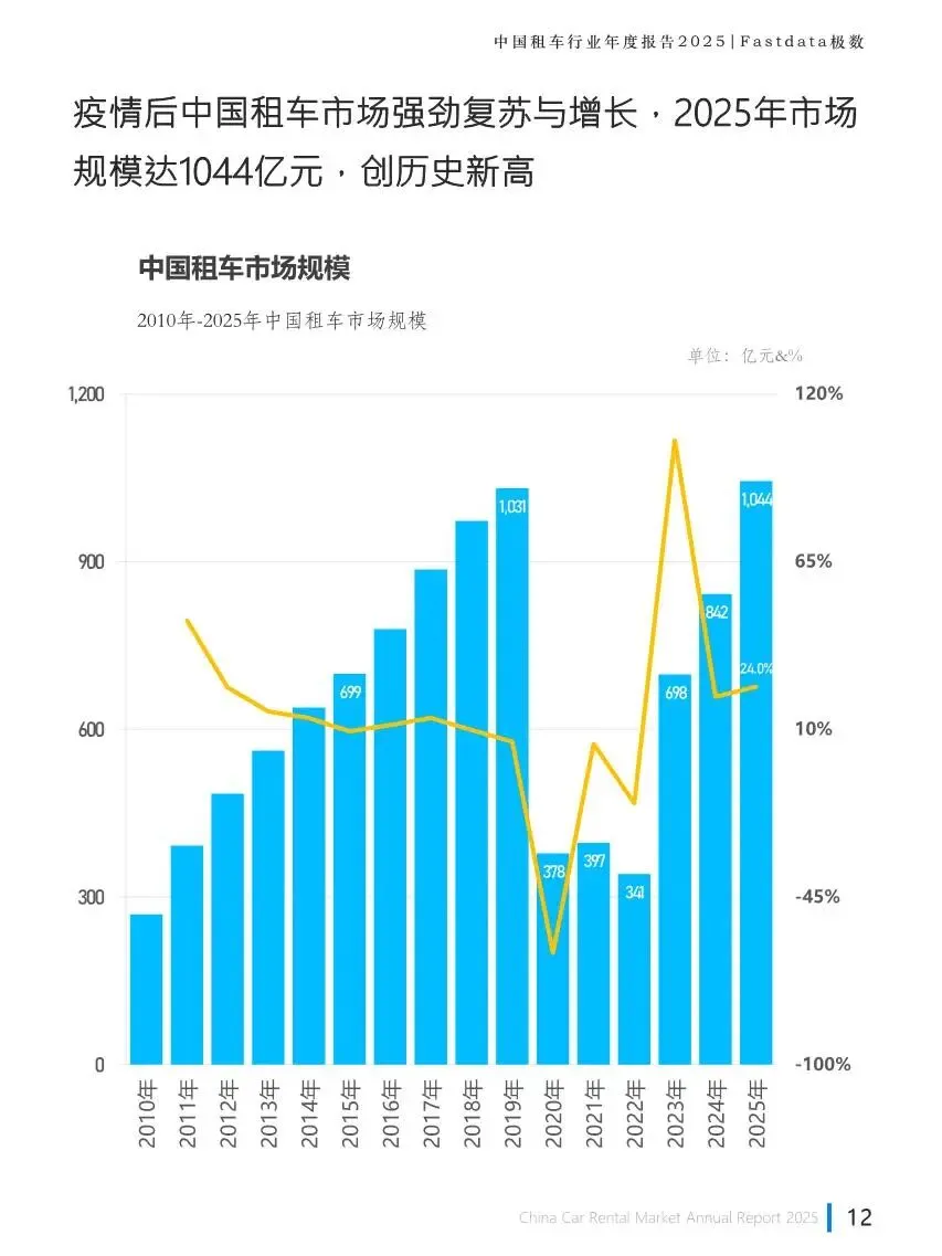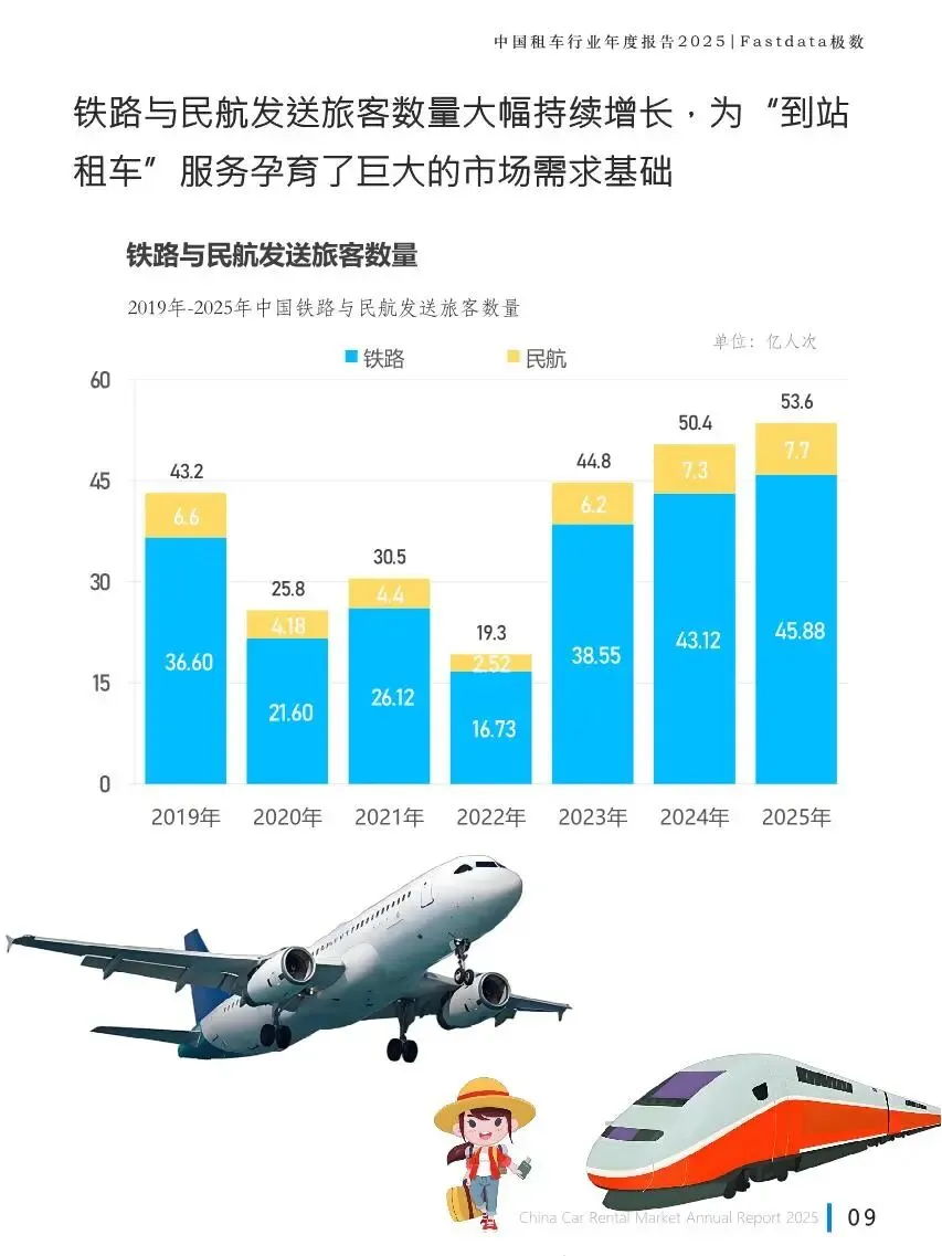 2025 年中国租车行业彻底走出疫情影响,市场规模达到 1044 亿元,同比增长 24%,创下历史新高。国内旅游人数持续增长,铁路和民航旅客发送量大幅提升,有驾照无车人群达到 1.93 亿,这些都为租车行业带来庞大的潜在用户。