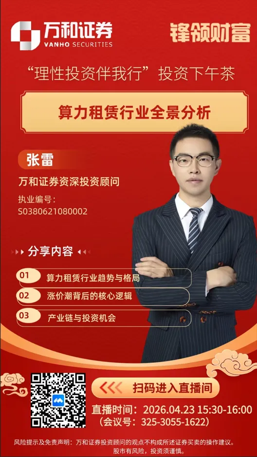 今天下午3:30的投资下午茶活动,万和证券投资顾问张雷将分享算力租赁行业的投资机会。欢迎您届时聆听,点击链接入会,或添加至会议列表: