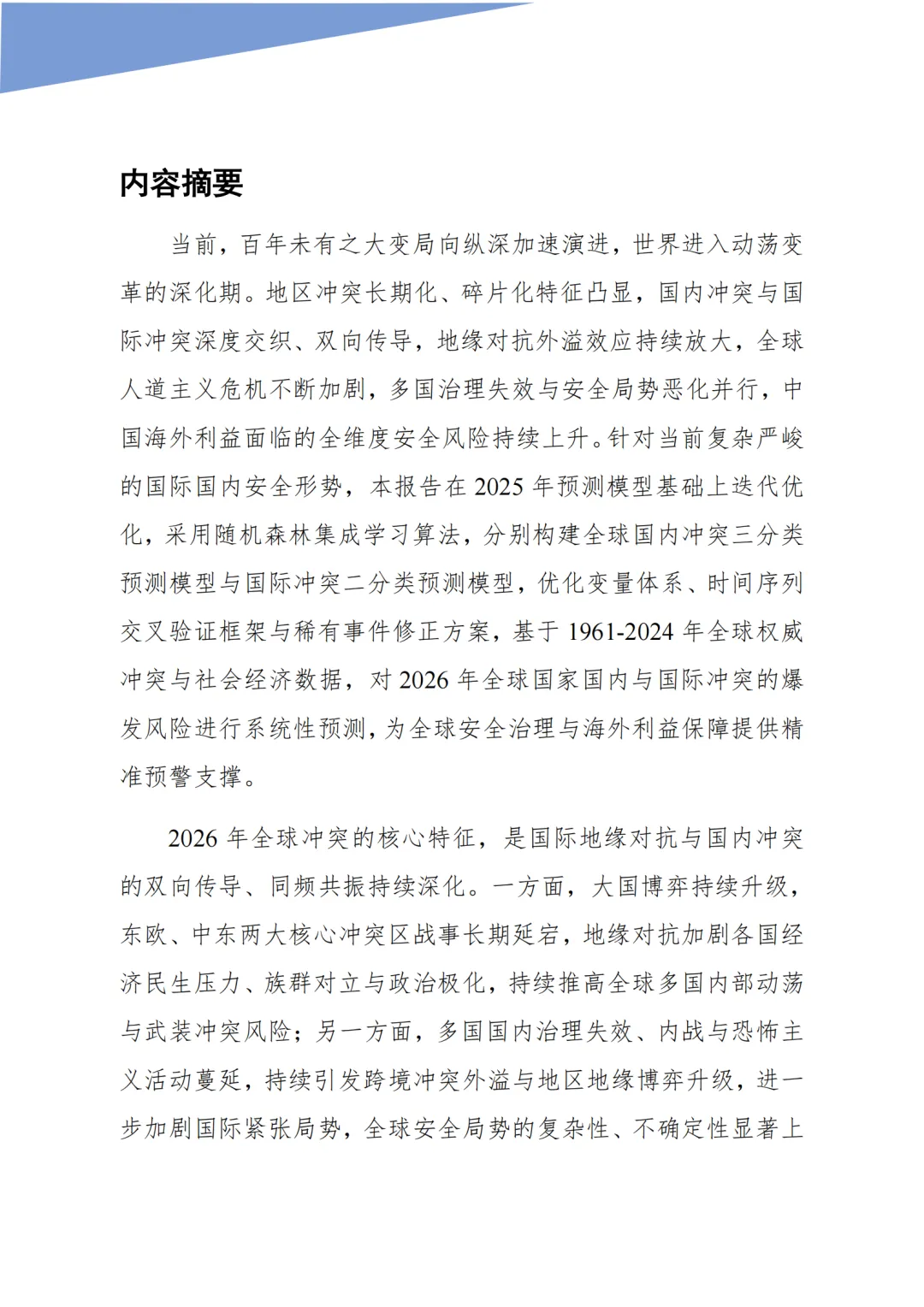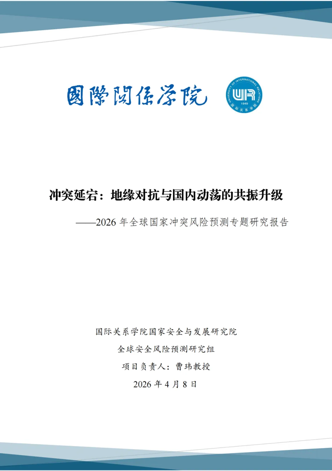 《冲突延宕:地缘对抗与国内动荡的共振升级——2026年全球国家冲突风险预测专题研究报告》通过量化预测与区域分析相结合的方式,为准确把握2026年全球安全走势、科学研判海外利益风险提供了重要支撑。该报告全文英文版将在我院《国际安全研究》英文刊International Security Studies 2026年第2期刊发。