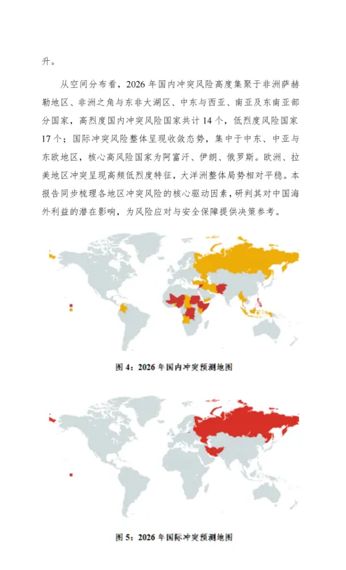 报告指出,2026年全球冲突的核心特征,是国际地缘对抗与国内动荡双向传导、同频共振持续加深。一方面,大国博弈持续演进,地区热点问题延宕升级,外部地缘竞争不断向有关国家内部传导,进一步加剧经济社会压力、政治极化、族群矛盾和治理失序,推动多国内部动荡与武装冲突风险上升。另一方面,部分国家国内治理失效、内战持续和恐怖主义活动蔓延,又通过难民流动、跨境暴力扩散和地区力量介入等方式外溢,进一步推高国际冲突风险,全球安全局势的复杂性、不确定性和联动性进一步增强。
