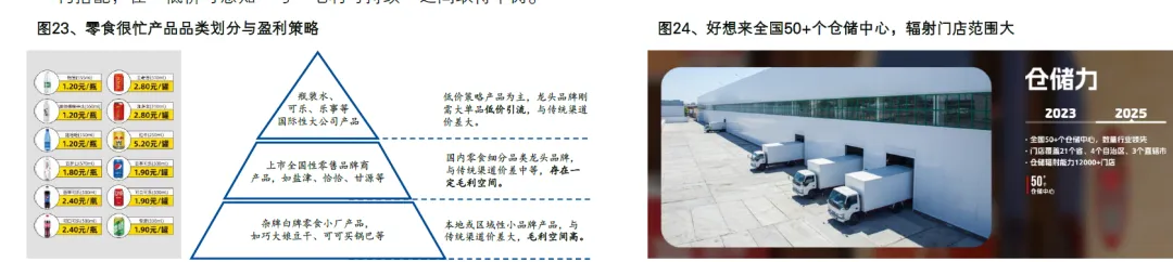 少SKUx高周转,把效率变成低价:量贩零食是“低毛利x高周转”的硬折扣模型。门店以刚需+头部品牌做低价引流,培养“价廉物美”的心智;利润主要由白牌/散称承接。SKU收敛、宽面陈列、按销量回补,减少滞销与损耗,把运营效率转化为更低的终端加价率与更高客流。中心仓直配,缩层级降成本:与上游厂商直采+中心仓直配,压缩经销层与返利链条;在结算上现货现结、减免入场/条码陈列等费用,到店成本更可控、供给更稳定,低价具备可持续性。当网络做大,仓配与物流的固定成本被摊薄,同时更大的采购体量带来更强议价权。轻资产小店型,放大“低毛利x高效率”:社区/街边小店配合标准化SOP,租金、人力等固定费用轻,坪效与人效更高;模型简洁、同品牌门店易复制,便于快速规模化。规模扩张反过来强化仓配承载力与直采能力,形成“规模一成本一价格”的良性循环。数据驱动动销,兼顾低价与盈利:以消费者洞察+动销数据指导选品、上新与代换,提高选品效率与管理效率;白牌/自有品牌与品牌通货的结构搭配,在“低价可感知”与“毛利可持续”之间取得平衡。