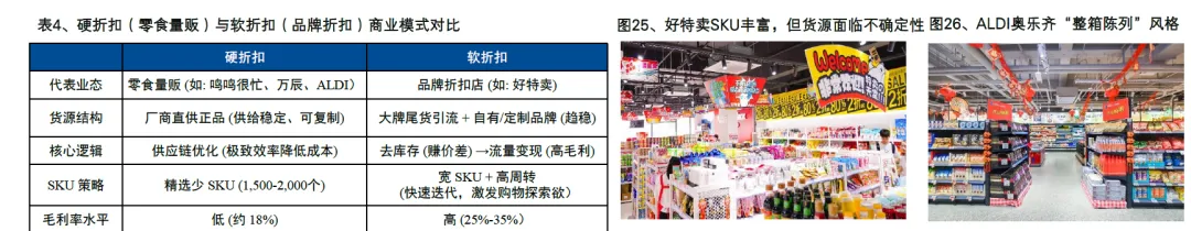 核心差异:全链路效率革命Vs “软硬结合”的流量逻辑。零食量贩(硬折扣)通过精简SKU和厂家直供重构供应链,赚取的是“效率的钱”相比之下,以好特卖为代表的软折扣业态已从单纯的尾货清理进化为“软硬结合”模式:利用大牌临期尾货作为流量入口(软折扣属性),同时大幅引入自有品牌及二三线定制品(硬折扣属性)来保证毛利与供给稳定性,本质是动态选品与探索性消费驱动的流量生意。盈利逻辑:低毛利倒通高周转,极致效率驱动模型跑通。软折扣业态通常需要维持25%-35% 的较高毛利率以抵消货源不稳定的风险:而零食量贩(硬折扣)主动将综合毛利率压低至18%左右(甚至低于15%)。这种“极致低价”策略倒逼企业必须实现极高的周转效率,通过薄利多销和快速回款来通过规模效应实现盈利,这是一种对运营能力要求极高的系统性效率革命。选品策略:精选高频刚需Vs海量SKU长尾覆盖。软折扣通过宽SKU(3000-4000个)覆盖长尾非标需求,主打差异化的探索体验。相比之下,零食量贩(硬折扣)则严格执行大单品策略,将单店SKU控制在1.500-2.000个左右的“黄金区间”。这种聚焦高频刚需的选品逻辑,使得企业能够集中采购资金打造“超级大单品”,从而获得对上游的绝对议价权,同时大幅降低了门店的库存周转压力。