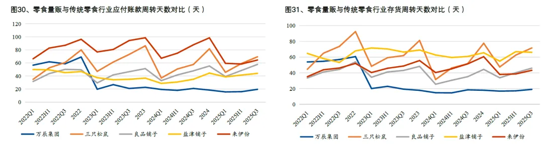 带薪流转”的现金流优势换取底价折扣。如图所示,相比传统零食企业(如来伊份、盐津铺子)通常40-60天甚至更长的账期,万辰集团(量贩代表)的应付账款周转天数稳定在20天左右,体现了极具吸引力的结算效率。在宏观环境承压下,这种“准现金”结算模式极大缓解了上游工厂的资金压力,作为交换,工厂会更愿意在出厂价基础上额外让利,从而在采购端锁定了成本优势。万店规模与极致周转构筑超级议价权。随着头部品牌门店数突破万家,单一SKU采购规模已非常可观。如图右侧所示,量贩模式的存货周转天数仅为20天左右,远低于传统模式的40天+。这种“快进快出”的高周转能力,结合巨大的采购体量,不仅摊薄了仓配固定成本,更让渠道拥有了类似山姆会员店的强势议价能力,形成了“周转越快一进货越便宜一价格越低一规模更大”的良性循环。