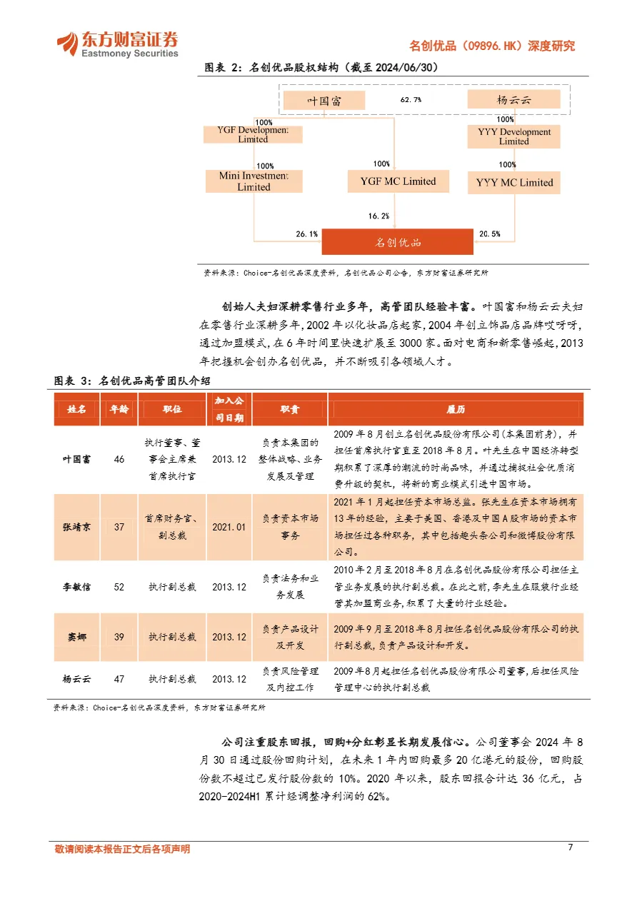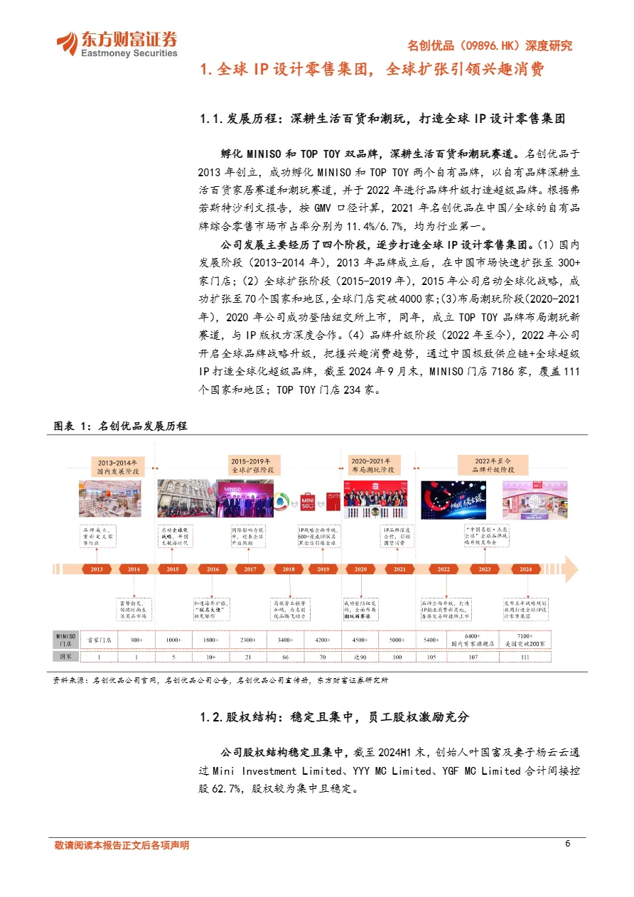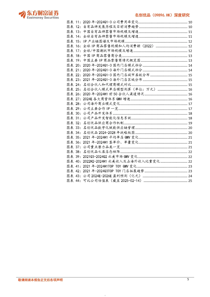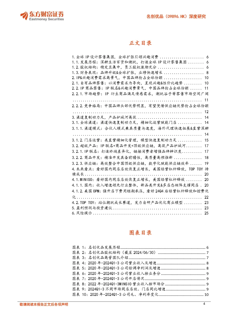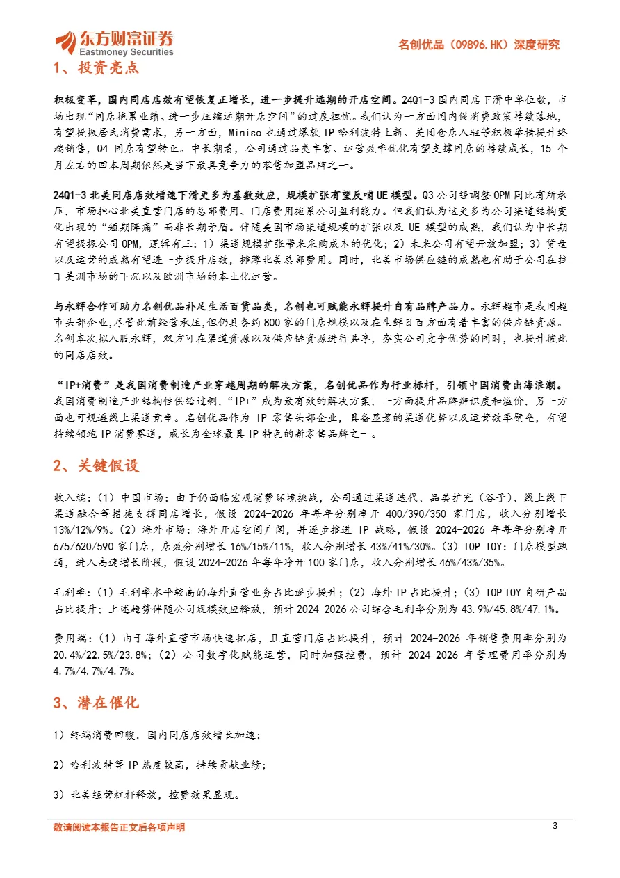 • “合伙人模式”实现类直营高速扩张:名创在国内通过“合伙人模式”统一管理选品、陈列、定价,单店回本周期仅15个月,2020-2023年年均净增386家门店,截至2024Q3国内门店达4250家,渠道复制效率极高。