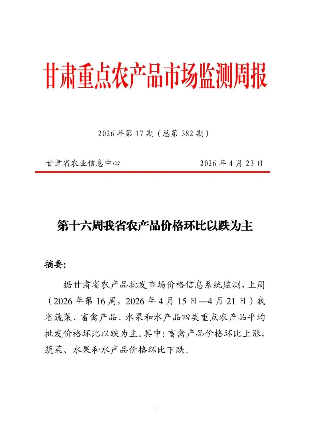 甘肃重点农产品市场监测报告【总第三百八十二期】