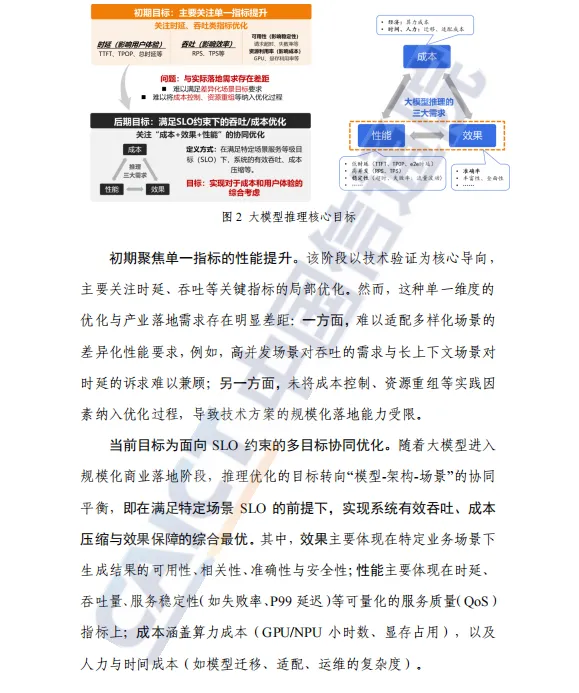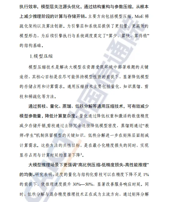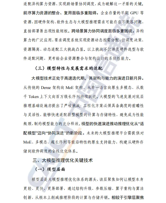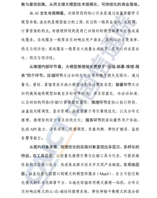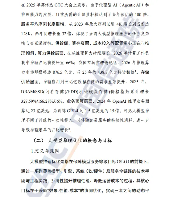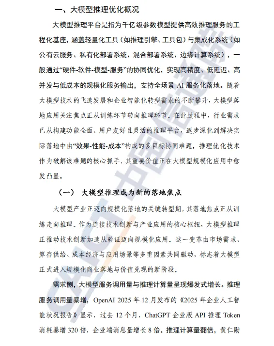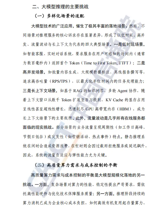 报告首先从宏观背景出发,指出大模型推理已成为人工智能技术从实验室走向规模化产业应用的“最后一公里”,其计算量、服务调用量及成本投入正呈现爆发式增长,同时也面临着多样化场景适配、高算力需求与成本控制平衡,以及模型架构快速演进带来的适配挑战。