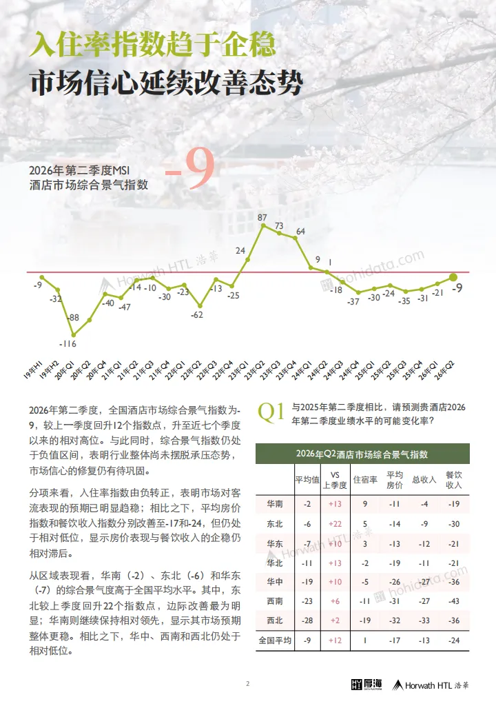 根据浩华发布的最新数据,2026年第二季度全国酒店市场综合景气指数为 -9。