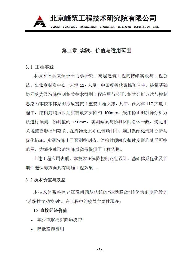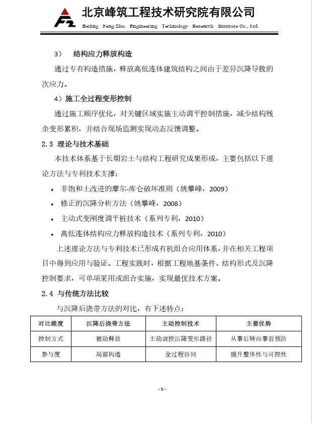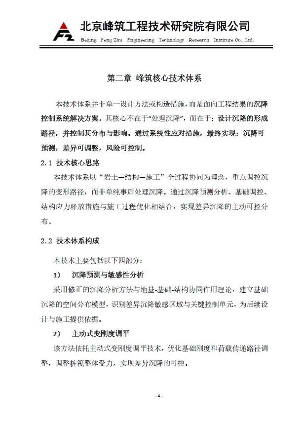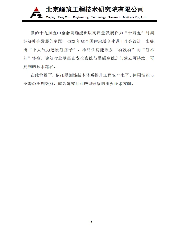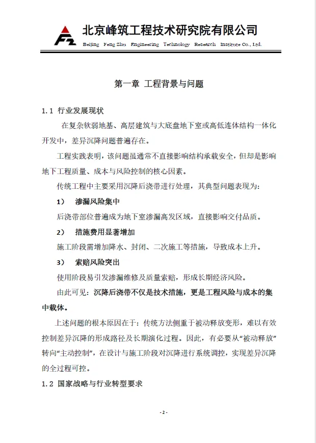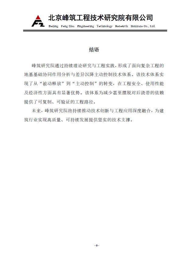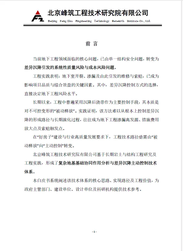 北京峰筑工程技术研究院有限公司基于长期岩土与结构工程研究及工程实践,形成了复杂地基基础协同作用分析与差异沉降主动控制技术体系。本白皮书系统阐述该技术体系的核心思路、实现路径及工程价值,为政府主管部门、建设单位、设计单位及科研机构提供技术参考。