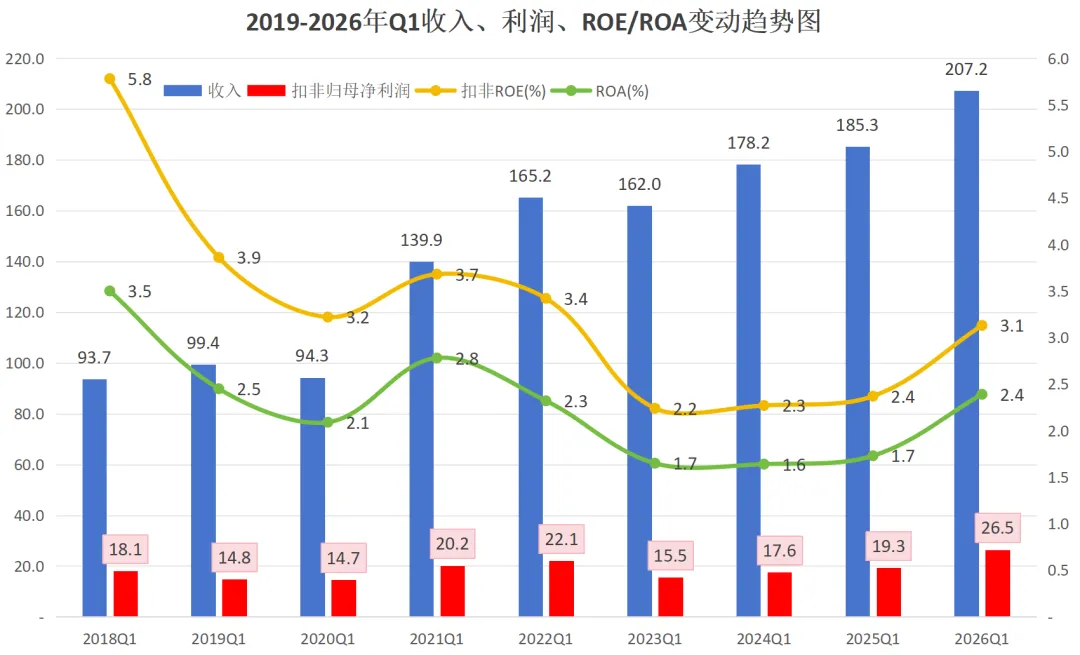 ROE15.6%可以拆解成:资产收益率11.2%*归母净利润占比92%*1.5倍财务杠杆的结果,经4年持续下降后,2025年已反弹,且2026年Q1持续增长,或已是拐点。
