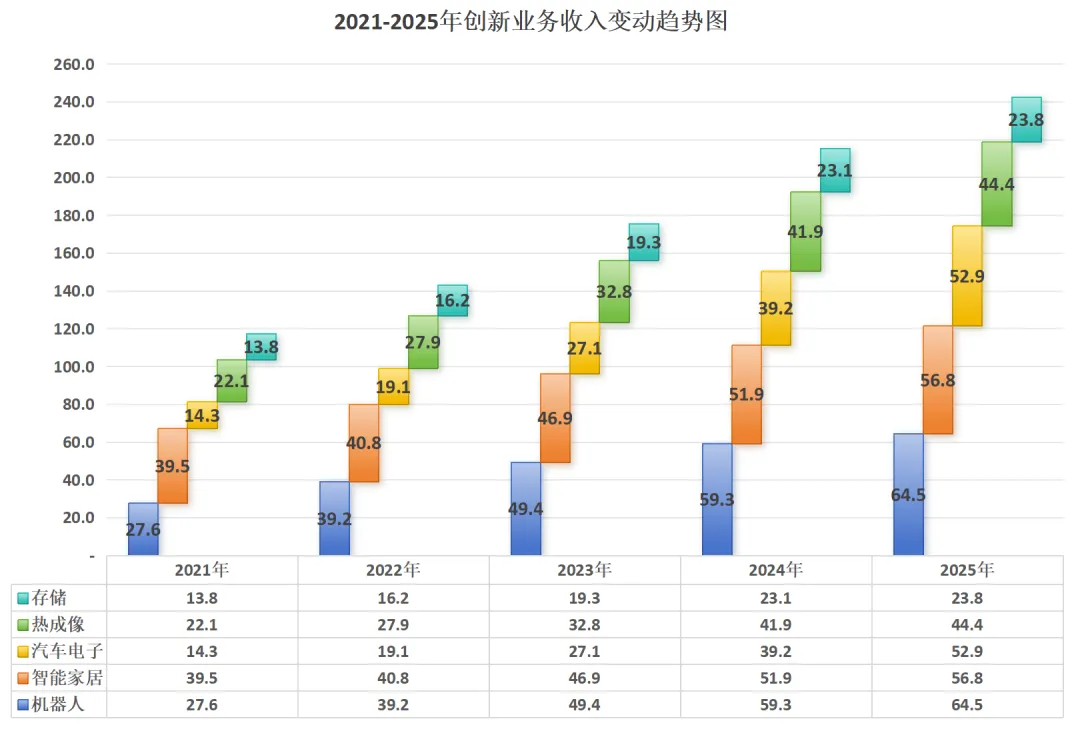 机器人:聚焦于工业物联网、智慧物流和智能制造领域,围绕“手、眼、脚”协同的技术架构深化业务布局,全面推动AI与感知、决策、执行系统的深度融合,持续在机器视觉、移动机器人、关节机器人等核心业务方向深耕开拓。目前属于创新业务中规模最大的业务,2025年收入64.5亿元,同比增长8.8%。