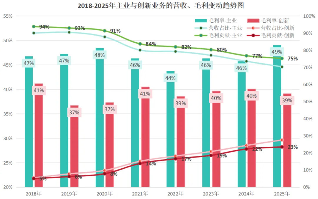 创新业务:2025年收入254亿元,近几年均保持正增长,营收占比提升至28%,但增速在降低;毛利100亿元,毛利率39%,比上年降低1个百分点,毛利贡献比例23%<营收占比,盈利能力相比于主业低。
