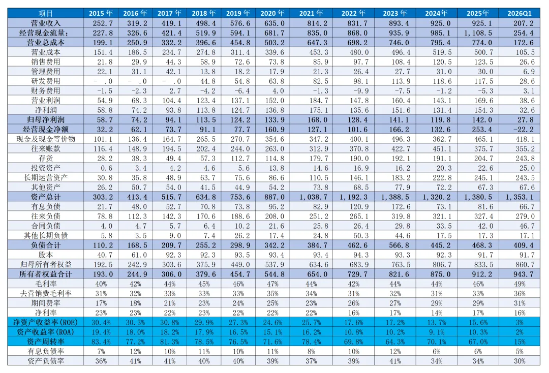 2015-2026年Q1,海康的资产负债、利润简表如下: