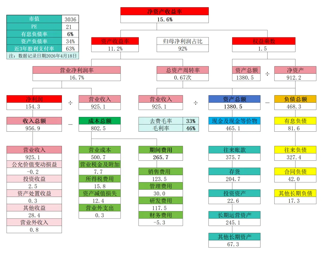 2.净资产收益率拆解:ROE15.6%,自2015年起,ROE由30%出头,到2018年后一路下滑,2024年达到最低仅有13.7%,2025年探底回升至15.6%