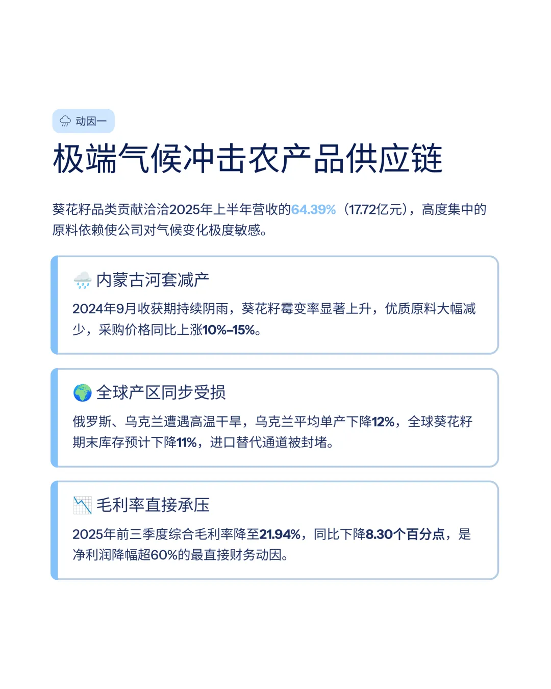 气候变化导致了葵花籽霉变率的明显上升,并造成优质原料总产量的大幅度减少。